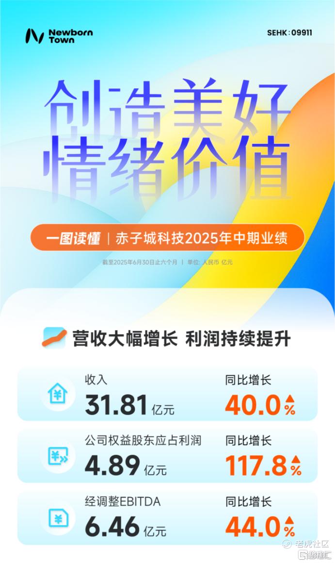 8 月 28 日,赤子城科技发布 2025 年中期业绩公告,得益于社交业务、创新业务双线爆发,以及 AI 技术的深化应用,公司上半年取得显着业绩增长,营收同比增长 40.0%,归母净利润大幅增长 117.8%。 $赤子城科技(09911)$