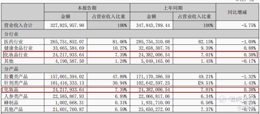 值得关注的是,2025年上半年,益盛药业化妆品板块实现营收2421.79万元,较上年同期实际下降0.67%,但公司在报告中却将其表述为同比增长0.38%。
