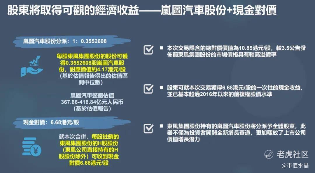 根据公布的方案,东风集团股份的股东将收到“岚图汽车股份+现金对价”:每股东风集团股份的股份可获得0.3552608股岚图汽车的股份,对应价值约4.17港元/股;每股注销的东风集团股份的H股股份(东风公司直接持有的H股股份除外)可收到现金对价6.68港元/股。合在一起,每股H股于建议交易下的合计理论总价值约为港币10.85元。