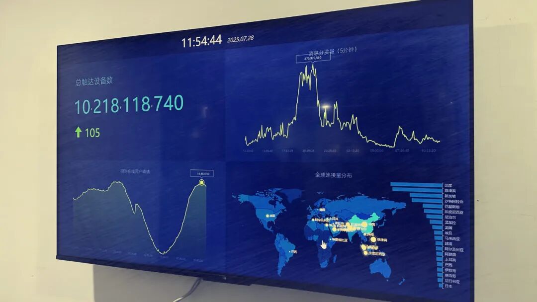 这是挂在融云办公室墙上的大屏,展示了总设备数、在线人数、消息数、全球触达情况。