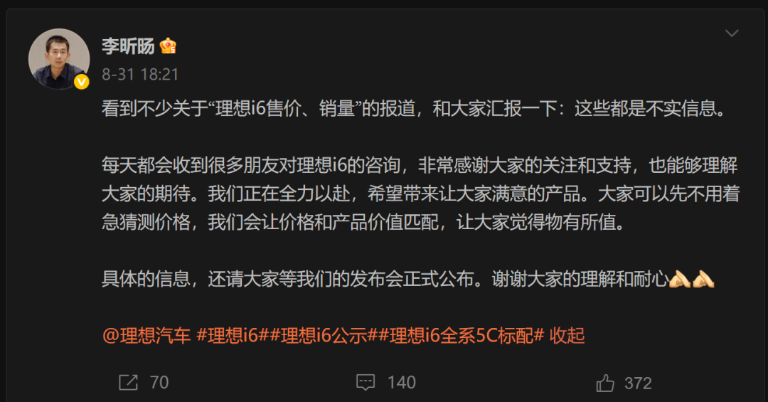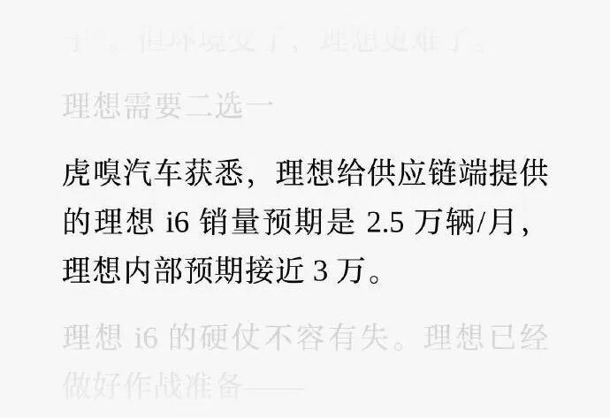 尤其是i6,几乎成为了理想汽车“不容有失”的产品。这款车曾经在网上“曝光”出高达2.5万/月的销量预期,甚至有博主根据这个预期,大胆预测起步价格在20万以内,但很快被理想官方“辟谣”了。