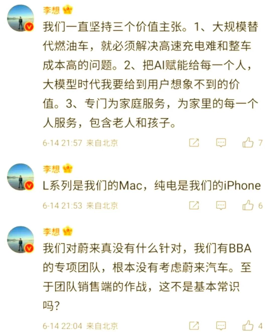 我可以说,那怕理想之前曾经在一线销售端全方位对着蔚来打,在未来它的对手也不再是蔚来。