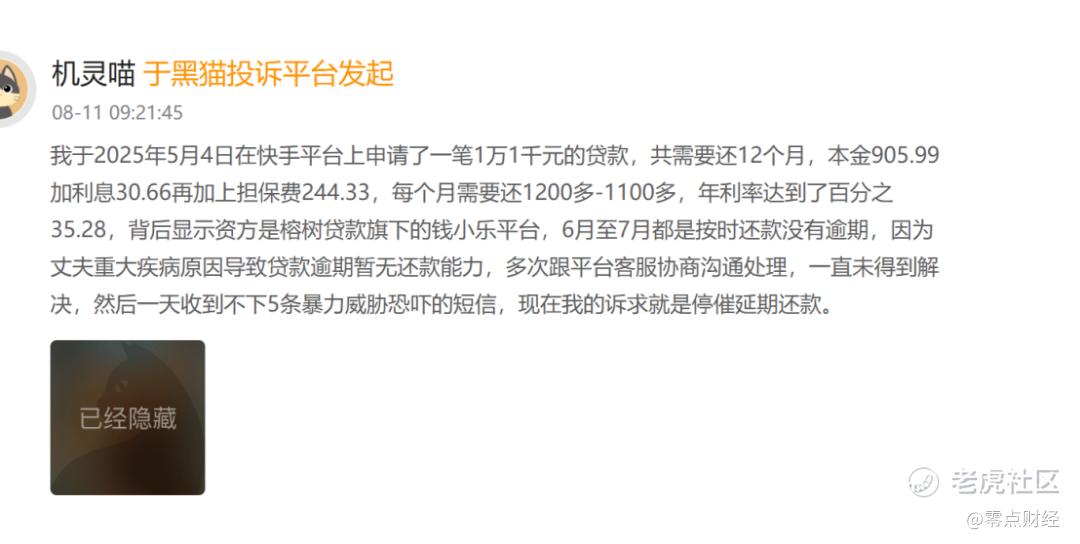 同日,另一用户称今年5月4日在快手平台借款1.1万元,资金方为钱小乐,分12期款还,每个月本金905.99元,利息30.66元,担保费255.33元。