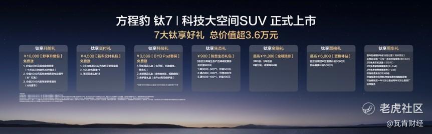 在购车权益上,方程豹更是诚意十足,为首批车主带来了总价值最高超3.6万元的7大钛享好礼!其中包括:覆盖多项座椅舒适配置的总价值10000元舒享升级包、价值3599元的BYD Pad套装、价值4500元的新车交付礼包均免费送;提供3年0息、5年低息、0首付起或至高84期等多重金融方案以供选择,金融贴息最高价值11300元;还有最高价值6000元的置换补贴、价值900元的智慧生态礼包,以及2年5G每个月的免费车机流量、非营运车辆长达6年或15万公里的整车包修、“三电”系统的终身保修、终身免费系统OTA升级等,让每一个家庭都能轻松拥抱钛7,让美好生活触手可及。