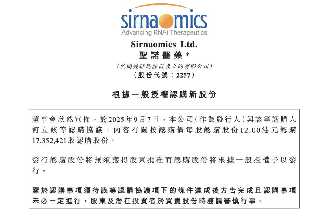 周末,港股上市Biotech公司圣诺医药发布公告,将以12港元/股的价格向四位认购人发行1735.24万股新股,占增资后总股本的14.16%,净筹资约2.06亿港元,发行价格跟上周五的收盘价打了八折(19.84%)。