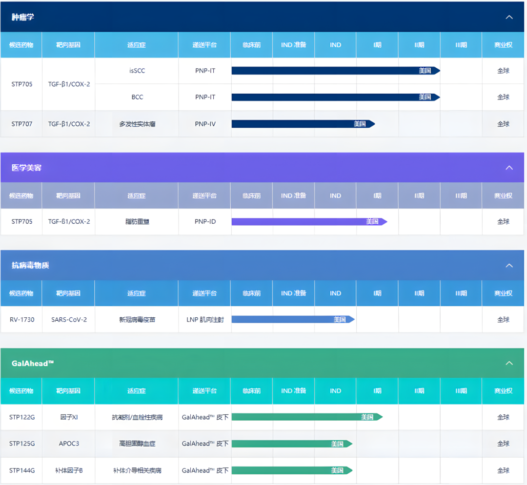 圣诺医药最早于2007年由原诺华的研发高管陆阳博士创立,拥有 GalNAc 、PNP、GalNAc-PDoV自主递送平台。圣诺医药的管线中进展较快的STP705(双靶点TGF-β1/COX-2)已进入肿瘤与纤维化适应症的临床2期,获多项FDA孤儿药资格。STP705在医美领域的定向减脂(用于成人腹部减脂)适应症在美国完成了临床1期。