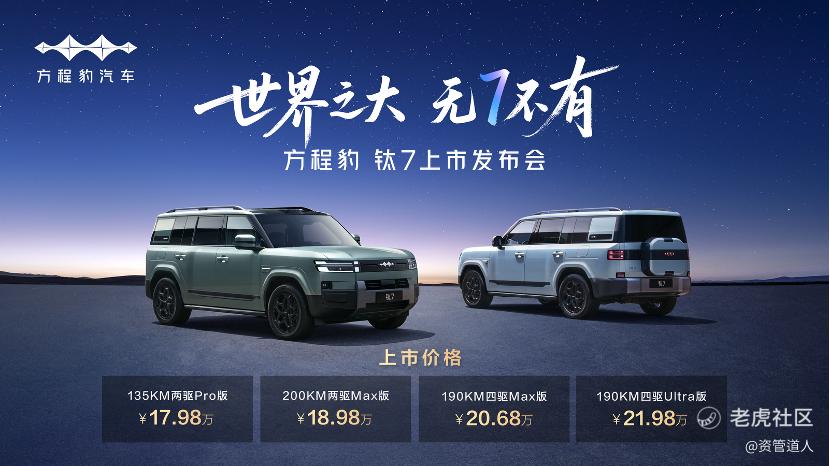 9月9日,方程豹品牌首款承载式混动方盒子——钛7正式上市,被称为比亚迪最新开创之作“大五座天花板出。来自发布会的信息显示,新车共推出4 款配置,售价在17.98 -21.98 万元之间。