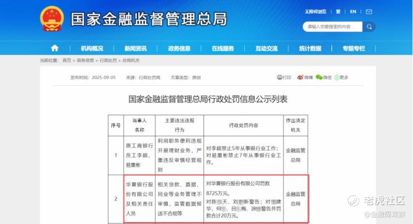 9月5日,国家金融监管总局一纸处罚公告披露:华夏银行被罚8725万元。