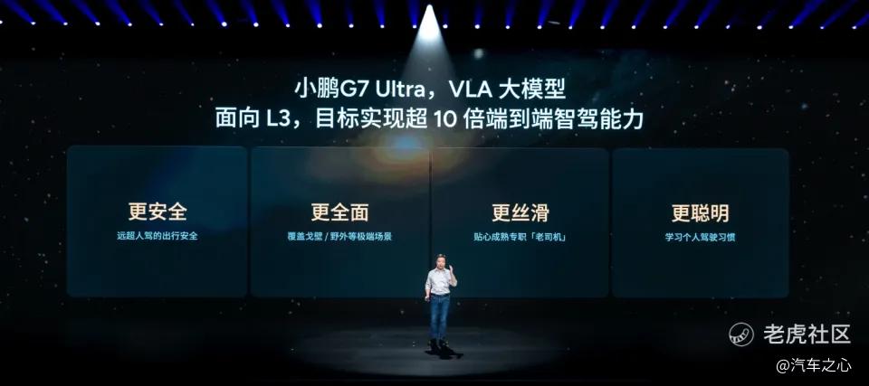 直到小鹏 G7 Ultra 发布会上,小鹏才明确表态,基于 3 颗图灵芯片与双激光雷达,小鹏 G7 Ultra 支持全场景 VLA,包括复杂路口决策、无车位泊车等功能,并在人机共驾模式下可以实现协同控制。