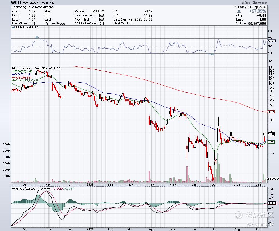 9月11日,半导体公司 $Wolfspeed Inc.(WOLF)$股价大涨27.89%,收于1.88美元,成交量近5600万股。这是公司连续多日暴涨的延续,9月9日其股价曾因破产重整计划获批而飙升近48%。