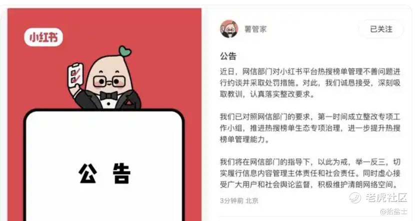 当日晚间,小红书官方账号“薯管家”迅速发布公告回应:“对此,我们诚恳接受,深刻吸取教训,认真落实整改要求。已第一时间成立整改专项工作小组,推进热搜榜单生态专项治理,进一步提升热搜榜单管理能力。”