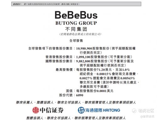 根据招股安排,不同集团将于9月15日至9月18日公开招股,发行价区间为62.01-71.20港元/股,每手入场约7191.8港元,市值预计介于56.27亿至64.61亿港元,并计划于9月23日正式挂牌上市。BeBeBus在本次发行中,共引入三名基石投资者——信庭基金、华泰资本最终投资客户和Great Praise分别认购500万美元。此前,BeBeBus还已获得天图投资、高榕创投、经纬创投和泰康人寿的投资。