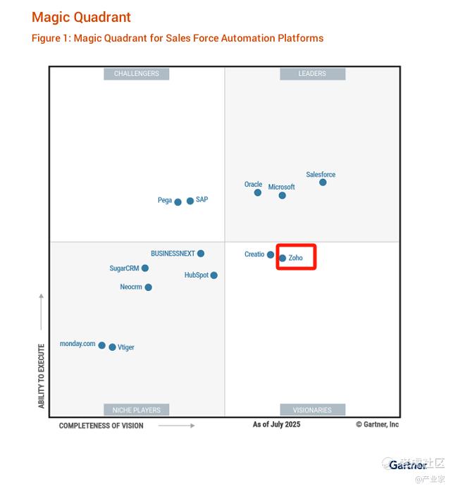 但在这些之外,更能看到的是,这些AI价值的更底层,也恰是Zoho原本就足够强大、灵活且专业的CRM等具备强流程、强权限知识的产品,这个如今已成为服务全球150多个国家和地区、30万家企业的CRM巨头,已经连续多年入选Gartner销售自动化(SFA)魔力象限“远见者”象限,在2025年更是跻身全球CRM综合实力Top4。