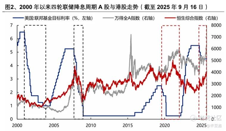 如果回到港A股的视角,回顾2000以来的联储四次降息周期,2000年12月与2007年9月后的衰退式降息中,A股与港股受全球经济衰退影响而整体调整;而在2019年7月与2024年9月联储预防式降息后,市场则更加定价基本面修复与流动性宽松,A股与港股整体上涨。