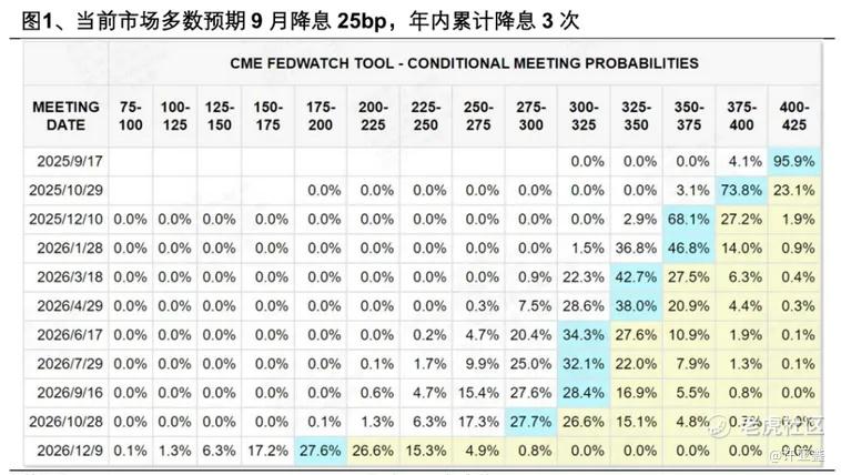 9月17日-18日,美联储即将召开9月份的议息会议,大概率重启降息周期。8月底美联储主席鲍威尔在央行年会上的置评,几乎是确认了9月份会降息,随后公布的劳动力市场的数据,以及PPI的数据,进一步确认了此事。市场当前预期美联储年内降息3次,对于9月的降息幅度,95%认为是25bp的“预防式降息”。