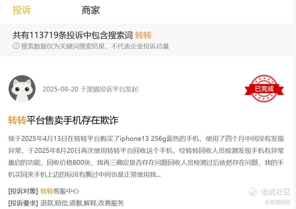 在黑猫投诉以“转转”为关键词进行搜索,共包含113719条投诉,不少用户表示在转转购买的二手电子产品存在货不对板,商家欺诈等问题。