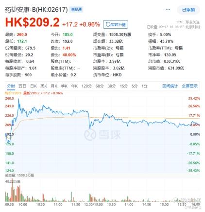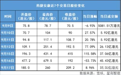 若聚焦最近一周,从股价暴涨前夕,即9月9日70.5港元/股的收盘价,到暴跌后9月17日209.2港元/股的收盘价,药捷安康一周的股价涨幅已达196.74%,期间最高的单日交易额达45.43亿港元。