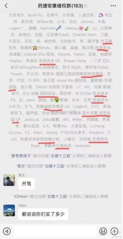 当日一大早,有网友贴出了一张新组建的微信群聊截图,名为“药捷安康维权群”,当时群里已有183人,其中不少群友还挂着投资机构的名字,有人在群里喊“开骂”,随后有人问:“都说说你们买了多少?”