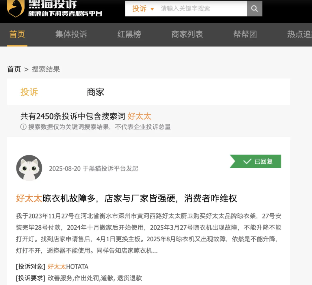 黑猫投诉显示,好太太的投诉量高达2450条,其中不乏其晾衣机故障问题。有用户反馈安装好太太晾衣架后,出现质量问题,经过检测部门确认后要给其更换产品,但沟通周期长达一个月;也有用户反馈,其购买好太太晾衣架语音功能无法使用。