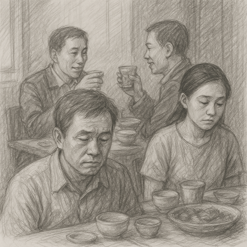 把上面这些零零散散的片段拼凑起来,像是一面镜子,折射出这个社会的两难:理想与现实之间的张力。人们嘴上喊口号,脚下却走着另一条路;孩子们在补课的漩涡里疲惫不堪,父母却告诉他们“必须坚持”;企业主推杯换盏,投资的是关系而非市场。矛盾不是例外,而是常态。同时,不论是企业主的饭局,国企员工的辛劳,还是理疗师的悄悄话,其实都指向同一个主题:活下去。嘴上说理想,说价值,说方向,但在具体生活里,所有人需要先选择“活下去”,然后才可能去考虑意义。矛盾并不是某些人的虚伪,而是环境的真实写照。