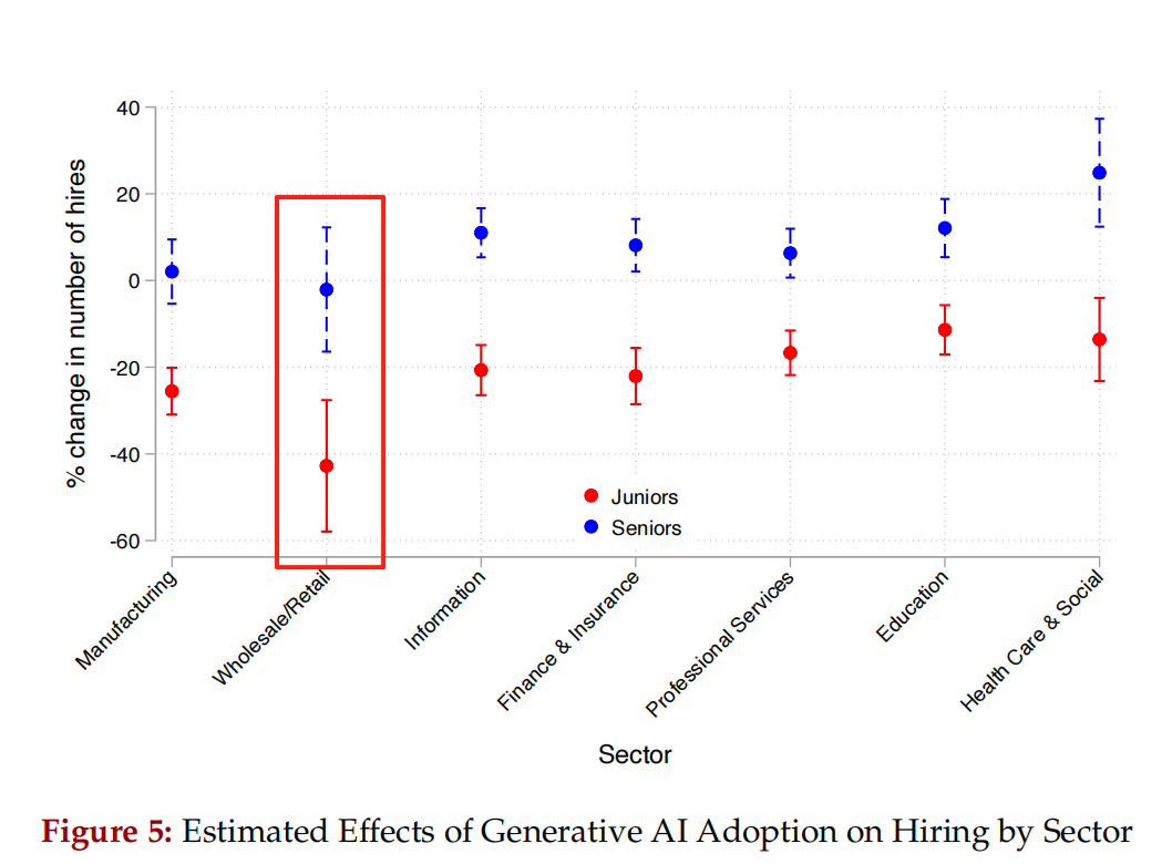 论文数据显示,这种对初级岗位的压缩效应,在所有行业都普遍存在,但程度不同。