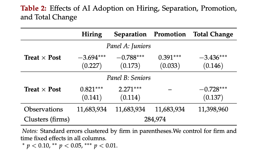 数据显示,与对照组相比,AI采纳者公司在2023年第一季度后,平均每个季度少招了3.7个初级员工。