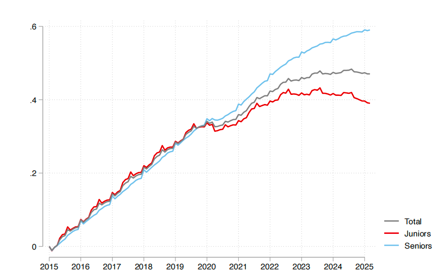 与此同时,高级岗位的就业在这两组公司里并没有出现这种差异,甚至AI采纳者公司的高级岗位增长还更强劲。