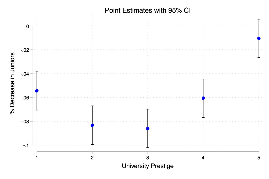 然后,他们观察了来自不同等级学校的初级员工,在AI采纳者公司里的就业变化情况。