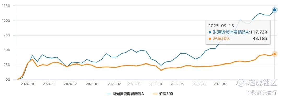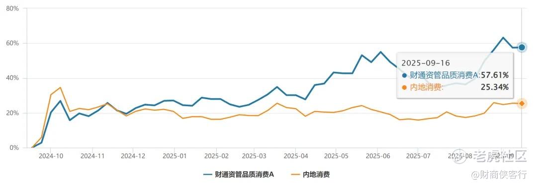 先来看财通资管品质消费A,近1年回报达到57.61%,跑赢行业指数超30个百分点(同期内地消费指数上涨25.34%),超额收益显著。(数据来源:Wind,截至20250916)