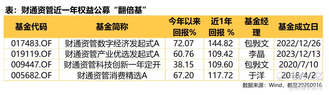 拉长到近1年的维度,除1只新产品外,其余全部产品收益均超过50%,更有4只实现翻倍。(数据来源:Wind,截至20250916)