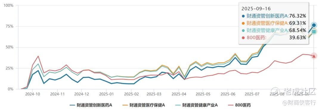 比如财通资管创新医药A,近1年上涨了76.32%,同期最大回撤为-14.45%,而800医药指数同期最大回撤达到-22.21%。
