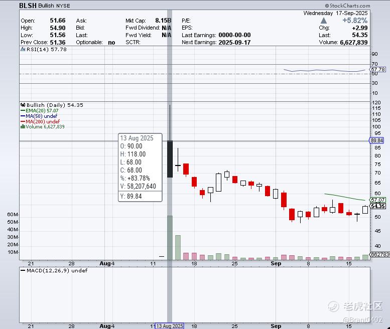 财报发布当天,BLSH股价在常规交易时段上涨5.82%,收于54.35美元;盘后继续攀升至56.80美元,涨幅4.51%。虽然距离IPO时的高点仍有不小差距,但股价似乎已在50美元附近找到支撑。
