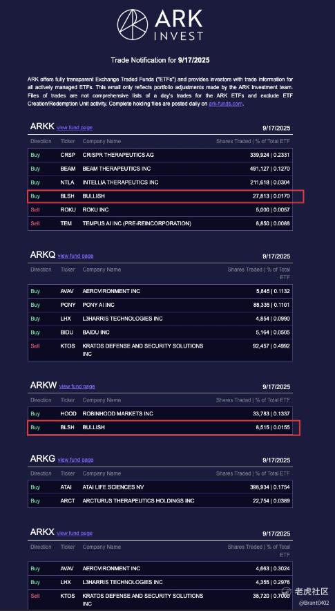 就在市场对Bullish股价心存疑虑时,Cathie Wood的ARK Invest却在过去一周逆势买入——在股价过去30天下跌18%的背景下,ARK通过旗下创新ETF和互联网ETF增持了总价值820万美元的BLSH股票。