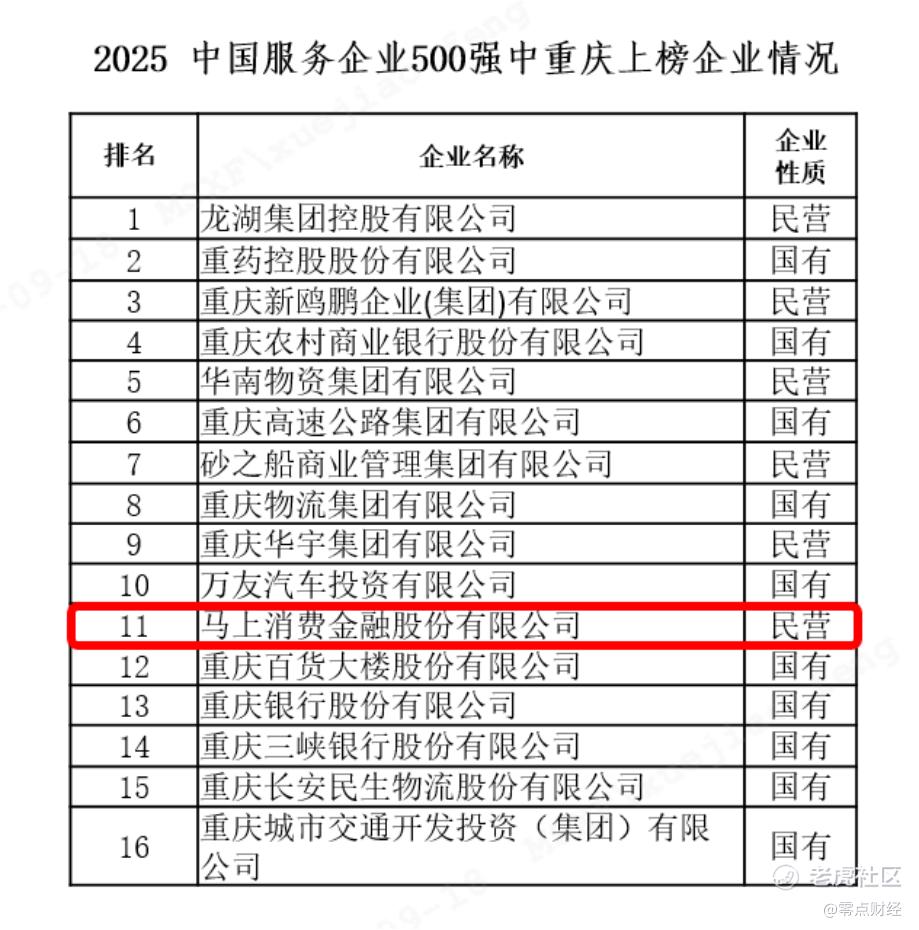 渝企力量!马上消费连续七年登榜中国服务业企业500强