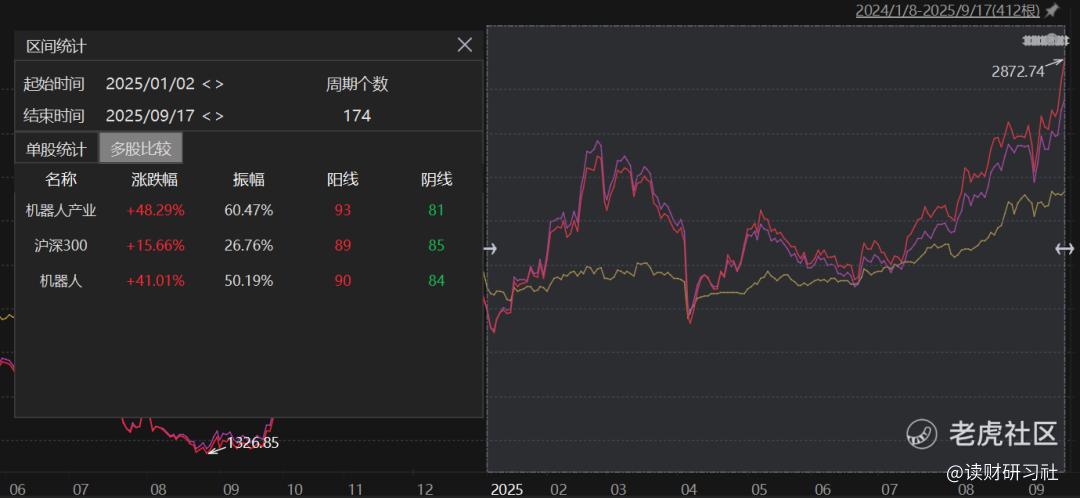 截至2025年9月17日,中证机器人指数上涨41.01%,国证机器人产业指数更是大幅上涨48.29%,显著跑赢沪深300指数33%的涨幅。