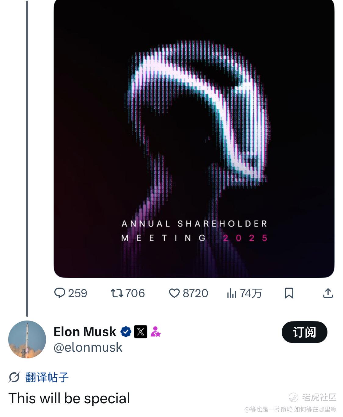 Elon Musk对11月6日召开的Tesla年度股东大会的评价是“This will be special”。