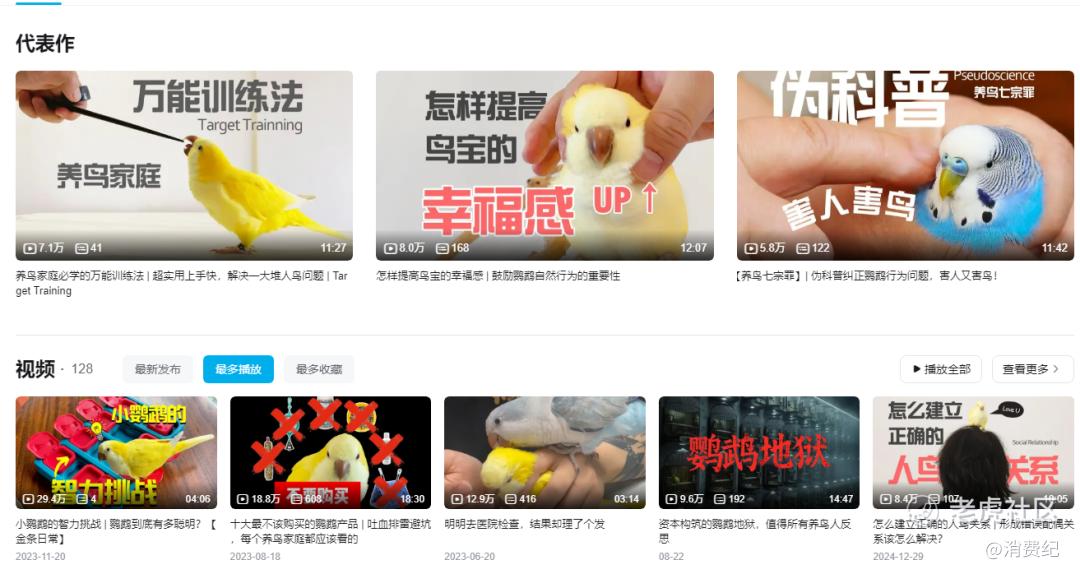 例如,B站博主“金条不是鸡”专注于输出干货视频,如“如何让害怕洗澡的鸟宝爱上洗”“养鸟家庭超实用的停留训练”等;博主“皮小皮-鹦语十级”则通过趣味性十足的科普内容,教导用户如何建立更良好的人鸟关系。
