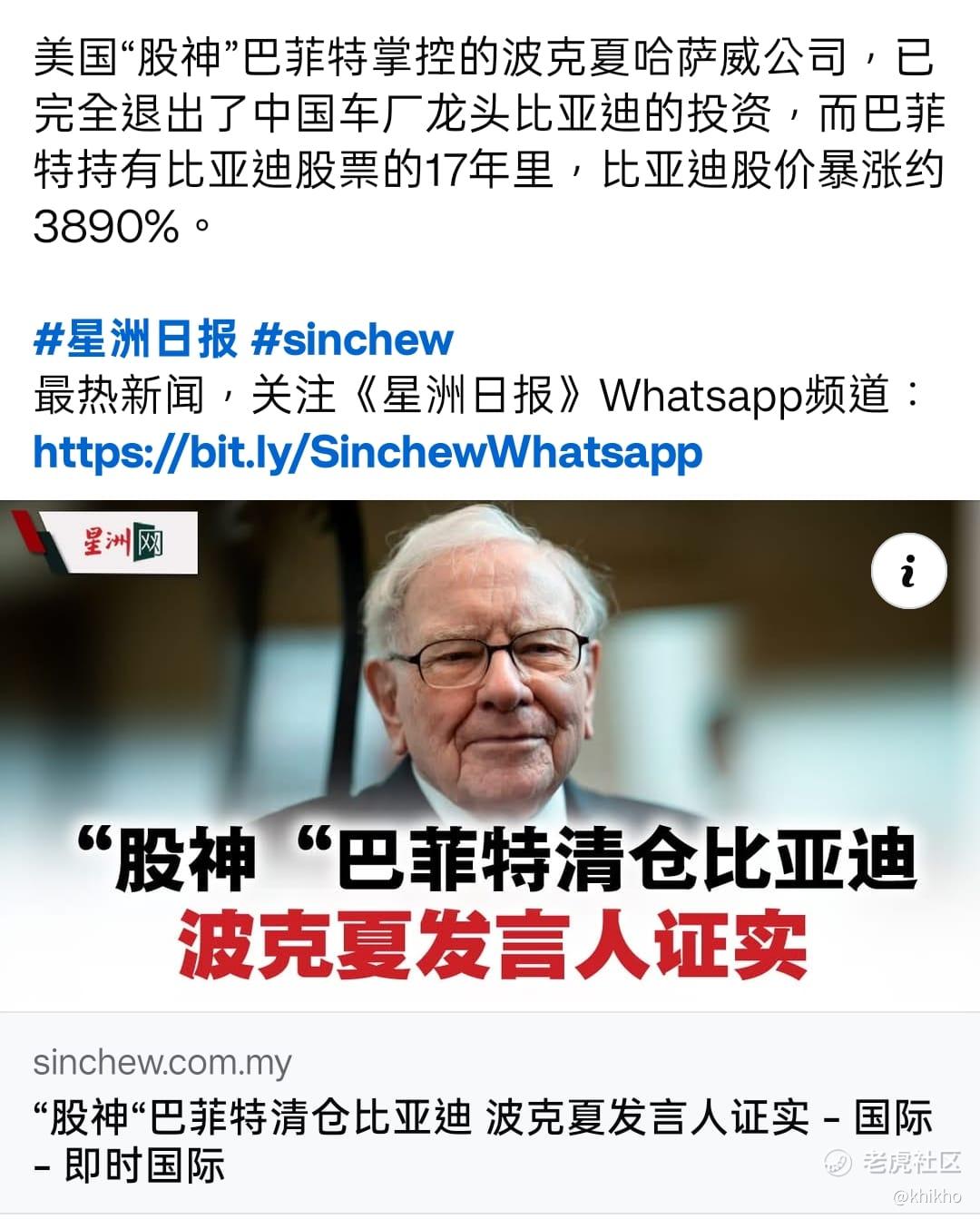 现在巴菲特旗下的伯克希尔哈撒韦(Berkshire Hathaway)彻底清仓比亚迪(BYD)的消息,又将会让多人追随着退场呢,至少我看到这则新闻的时候,我的第一反应就是,比亚迪做错了什么啊 [捂脸]