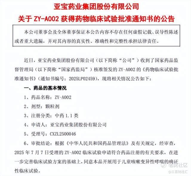 9月23日,亚宝药业发布最新公告,宣布公司收到了国家药监局核准签发的ZY-A002的《药物临床试验批准通知书》。