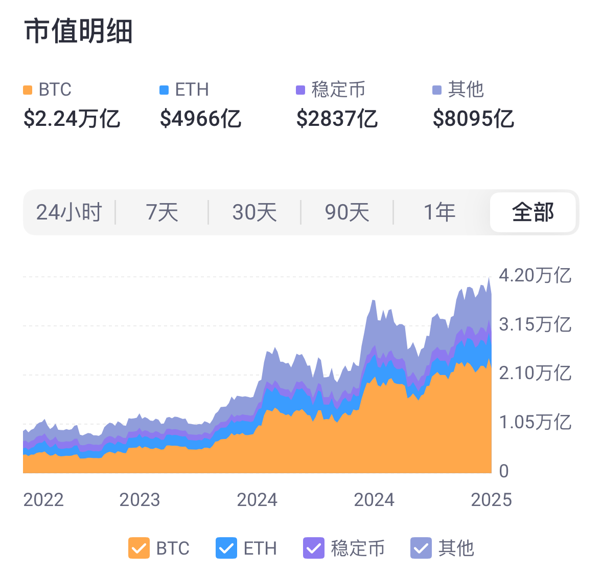 将市场市值拆解为 BTC、ETH、稳定币、其他 四大类,帮助你清楚了解不同币种的分布情况。