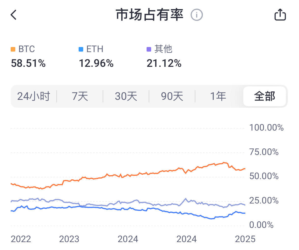 展示主要类别的市场份额占比,目前包括 BTC、ETH、其他。