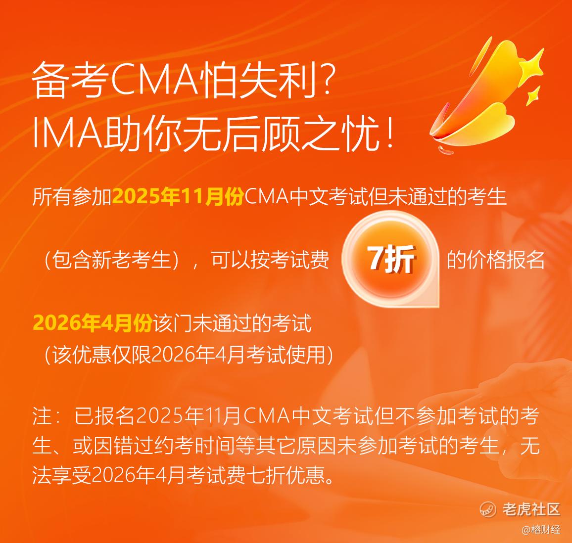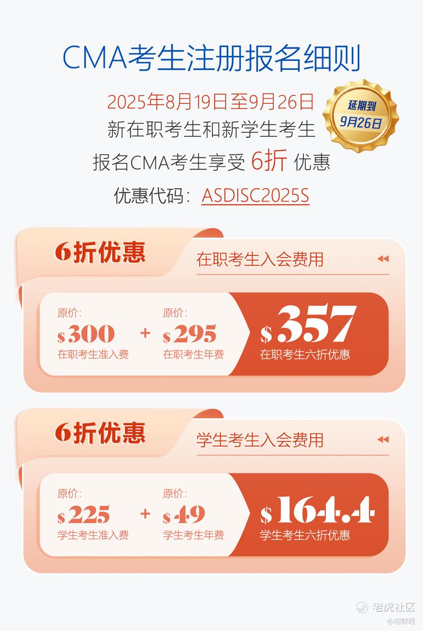 为助力财务专业人士深入学习管理会计,提升职场竞争力并拓展优质人脉,IMA协会特别推出限时福利“不想被AI掌控?考下CMA,重夺财务职场话语权!”活动仅剩最后2,000个名额,截止日期延长至9月26日。新在职及新学生考生可享准入费与考生年费6折优惠,补考考试费7折优惠(新老考生不限,规则见下图)。名额有限,报满即止,请尽快报名,切勿错过最后机会!