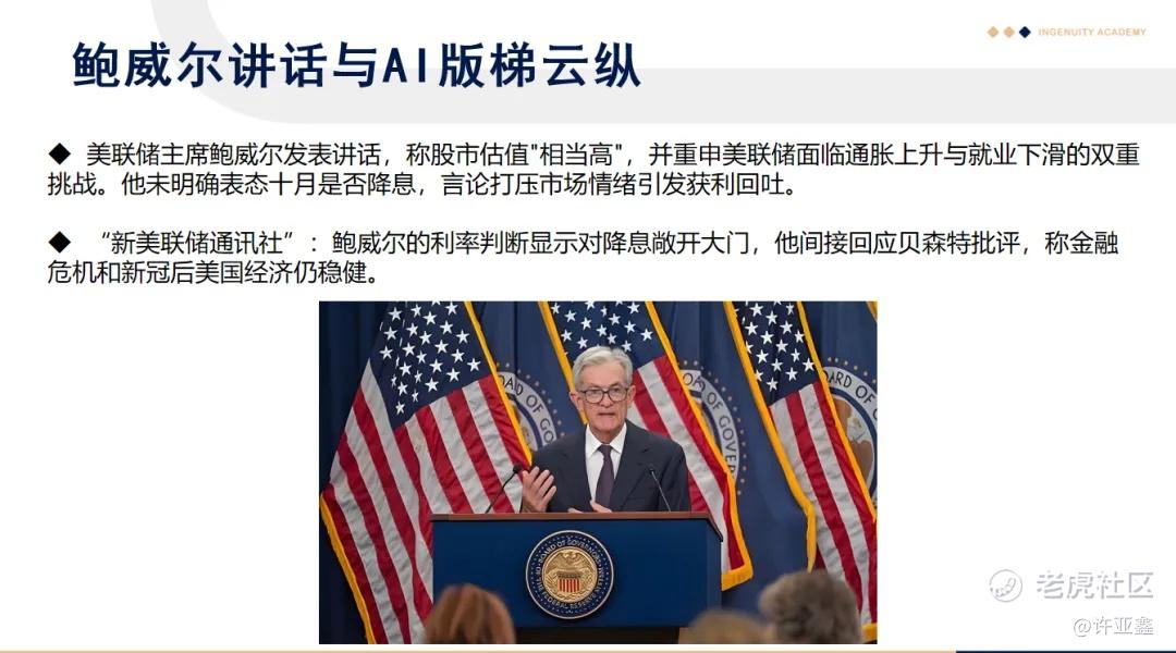 如上图所示,美联储主席鲍威尔发表讲话,称股市估值"相当高",并重申美联储面临通胀上升与就业下滑的双重挑战。他未明确表态十月是否降息,言论打压市场情绪引发获利回吐。