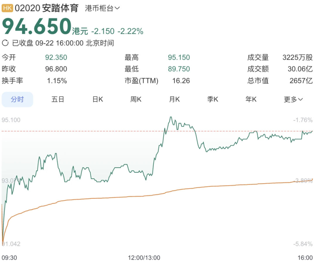 值得一提的是,始祖鸟母公司亚芬体育中国刚刚换了负责人,新董事长成为烟花事件的“受害者”;另一方面,亚芬体育的母公司安踏也受到了冲击,9月22日,安踏股票一度下跌超4%,最终收盘价94.65港元,下跌2.22%。
