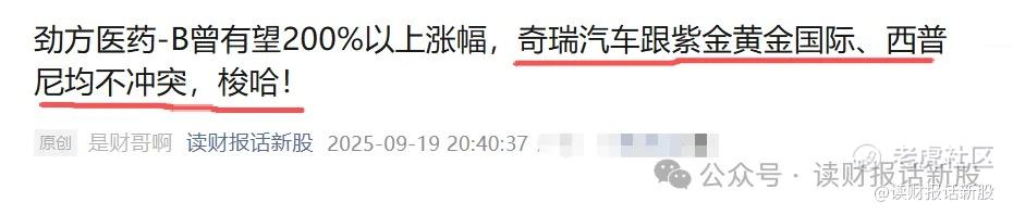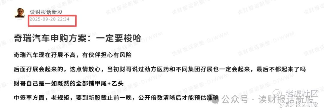 同日晚上,在公号上发文,提出奇瑞不会跟紫金黄金等新股冲突,提醒一定要梭哈打