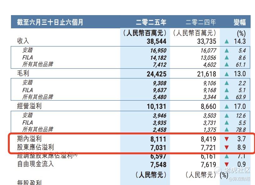 财报显示,今年上半年安踏体育实现营收385.4亿元,同比增长14.26%;实现净利润70.31亿元,同比下跌8.94%,这也是安踏近年来首次出现半年度净利润同比下滑的情况。