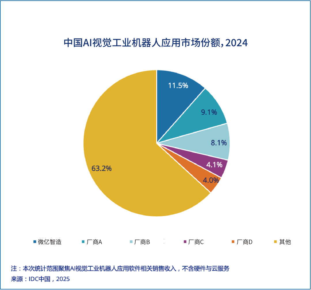 IDC最近发布的《中国AI视觉工业机器人应用市场份额,2024》显示,微亿智造凭借深厚的技术实力及多场景规模化应用,实现了全年AI视觉工业机器人应用市场份额全国第一,持续领跑行业。