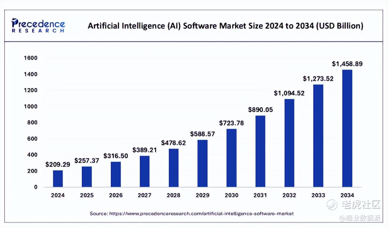 Precedence Research在今年1月发布报告称,2024 年全球人工智能 (AI) 软件市场规模为 2092.9 亿美元,预计到 2034 年将达到约 14588.9 亿美元,2025 年至 2034 年的复合年增长率为 21.43%。在此基础上,考虑到自进化能让AI变得更强大。或许,现在对于AI的市场预测还是“太过保守”。