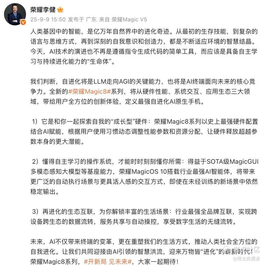 “AI技术,应该是具备自主学习与持续进化能力的“生命体”。”9月,荣耀CEO李健也在微博上发布了AI自进化的观点。