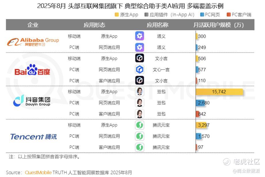 在手机之外,荣耀也在思考如何让用户在不同终端都能体验能自进化的AI。根据QuestMobile的研究显示,当前不少科技大厂都在积极布局AI跨端能力,希望为用户提供无缝衔接的全场景服务。观察不同终端的活跃用户数量看到,互联互通的AI生态有利于AI厂商在不同终端维持“强者恒强”的身位。